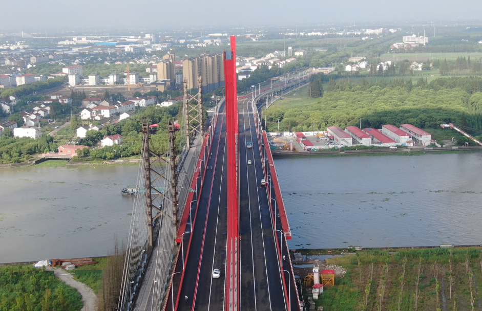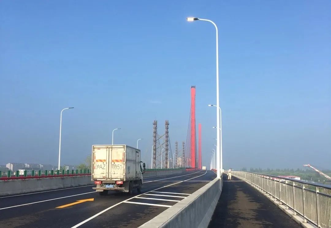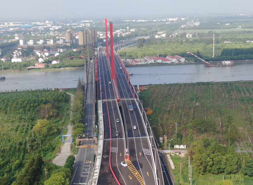 葉新公路泖港大橋工程位于上海市松江區泖港鎮,線路為東西走向,新建泖港大橋于2018年4月動工興建,主橋一跨過河、采用鋼塔鋼箱梁平行單索面斜拉橋,塔梁固接、塔墩分離體系,主橋跨徑445米,其中主跨225米,主塔高60米,主跨寬38.5m,為一級公路,雙向6車道及人行道、非機動車道。此前,2020年5月20日,新建泖港大橋實現主橋合龍。